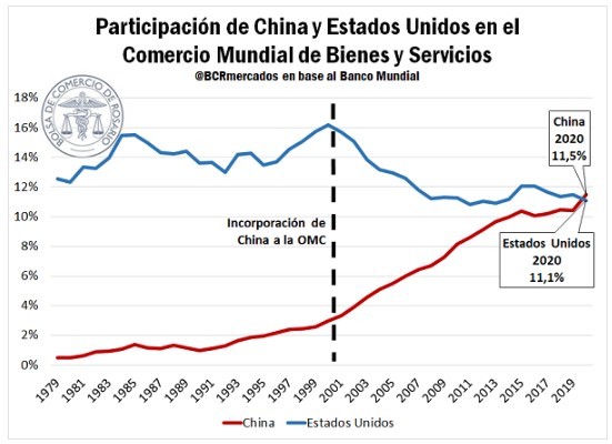 Uno de los elementos más trascendentes es su rol en el comercio mundial. Tras su incorporación a la Organización Mundial de Comercio en 2001, su participación en el intercambio global sostuvo un notorio crecimiento. Mientras que previo al 2000 el 80% de los países comerciaba más con Estados Unidos que con China, el gigante asiático es, actualmente, el principal socio comercial de 128 de los 190 países que existen en el mundo.