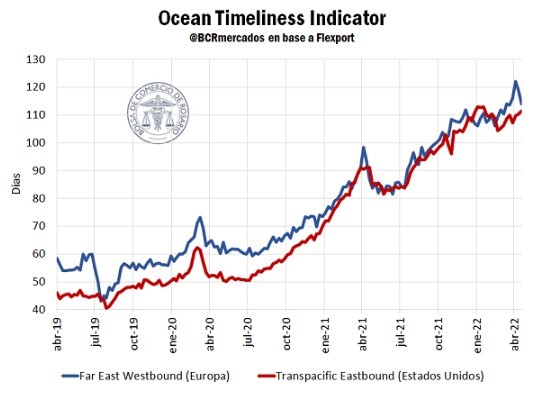 A finales de abril, de acuerdo al Ocean Timeliness Indicator que elabora la empresa Flexport, una empresa estadounidense dedicada al transporte de marítimo de cargas, el tiempo que transcurría desde que la carga estaba lista para ser transportada en la puerta de la fábrica exportadora en China hasta que estaba lista para salir del puerto de destino hacia el depósito del importador en Estados Unidos era, en promedio, 110 días (muy cerca del récord de 113 días de enero del corriente año y más del doble de tiempo que requería en abril de 2019). El caso de Europa requería un tiempo incluso mayor de 114 días (el récord fue a comienzos de abril con 122 días).