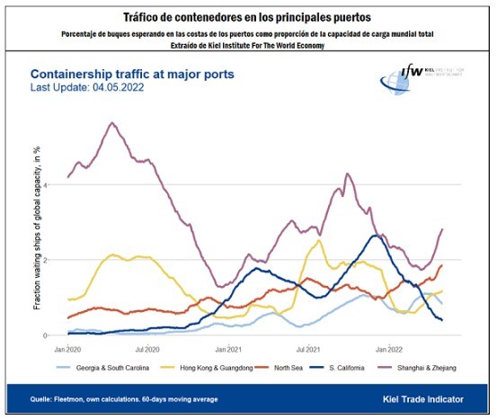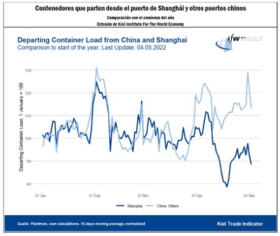 Es por ello que, a pesar del bajo tiempo de espera que tienen los contenedores que ingresan al puerto de Shanghái, el número de contenedores que salen desde allí se desplomó desde fines de marzo hasta mediados de abril, y, si bien tuvo un leve repunte en la segunda quincena del último mes, el comienzo de mayo trajo un nuevo retroceso. El gráfico que sigue, elaborado por el Kiel Institute For The World Economy muestra precisamente esta situación, y además muestra la cantidad de contenedores que partieron desde otros puertos chinos. Si bien no exhiben una caída de la magnitud que sufrió el principal puerto del mundo, también se puede apreciar un fuerte recorte en los primeros días de abril y una nueva caída en el comienzo de mayo.