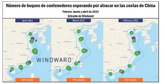 A mediados de abril, nada menos que un quinto de todos los buques de transporte de contenedores a nivel mundial se encontraba en las costas de algún puerto esperando por amarrar. Además, de ese total, un 25% estaba esperando por atracar en algún puerto chino.