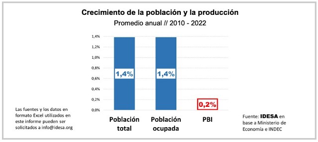 Estos datos muestran que la población total y la población ocupada en el mercado laboral crecieron a una tasa mucho mayor que el modesto aumento en la producción de bienes y servicios. Que la producción crezca menos que la población ocupada indica que los otros dos factores determinantes del desarrollo –capital (inversión) y eficiencia– hicieron una contribución negativa a la producción. Se produce así una caída de la productividad, ya que la cantidad de bienes y servicios crece menos que la población. Esta es la clave para explicar la decadencia económica y la persistencia estructural de la pobreza.