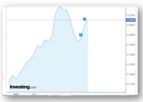 En el cuadro de abajo se puede visualizar cómo el real en términos del dólar fue subiendo, desde el comienzo del año. Se elevó de 0,1750 a 0,2075.
