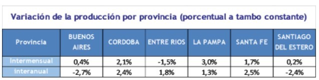 En el cuadro siguiente observamos el comportamiento de la producción medida a tambo constante (no se incluyen ingresos y egresos de nuevos tambos) respecto al mes anterior y respecto a igual mes del año anterior. Por provincia, en general todas subieron en la comparación intermensual salvo Entre Ríos, pero cuando lo miramos de forma interanual casi todas las provincias crecieron entre 1,3 y 2,5% y las que cayeron fueron Buenos Aires (que por su importancia relativa, reduce el promedio de suba) y Santiago del Estero.