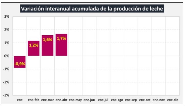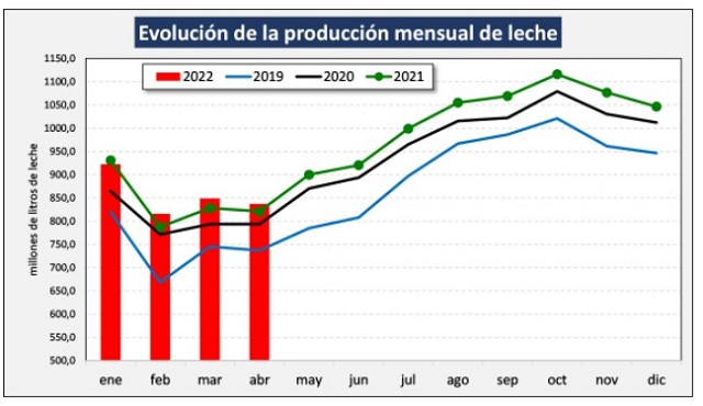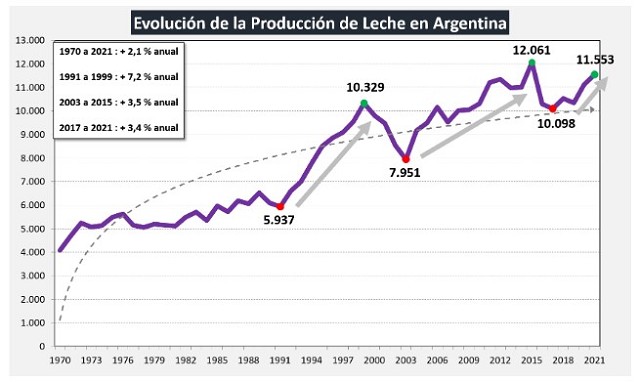 La producción total de leche alcanzo en 2021 los 11.553 millones de litros, es decir, 4,0% más respecto al año anterior y 11,7% respecto al 2019 (+ 1.210 millones de litros de leche).