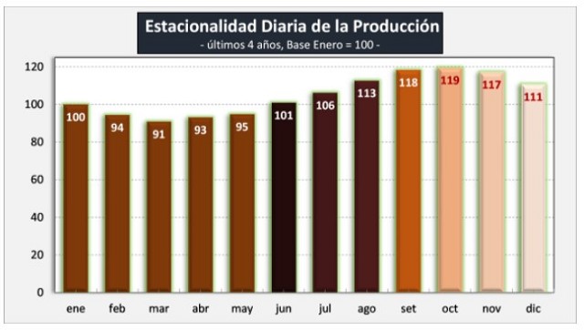 Como es habitual, la producción desde el pico de máxima en octubre, cae a una tasa del 5% mensual hasta marzo/abril (tomando el promedio diario de producción, para que no afecten la cantidad de días de cada mes), donde luego comienza un nuevo repunte hacia octubre.