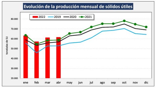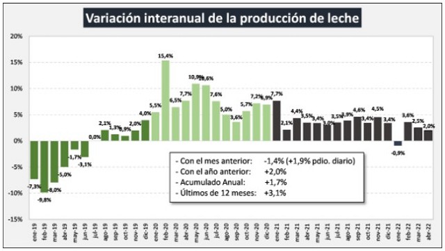 Un dato importante que arroja el gráfico anterior, es que hacía 30 meses consecutivos que la producción crecía interanualmente y en enero 2022, aunque leve, se ha dado una caída, pero teniendo en cuenta que en los dos eneros anteriores la producción creció 5,5% y 7,7%, lo cual hace que comparemos con una base muy alta. Además, esa caída hoy se vuelve a revertir con las subas interanuales de febrero, marzo y abril.