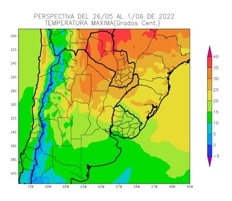Al comienzo de la primera etapa de la perspectiva, los vientos del trópico mantendrán temperaturas máximas elevadas sobre el norte del área agrícola, mientras que el centro y el sur experimentarán registros mucho más bajos debido al avance de una masa de aire polar que viaja con el frente de tormenta que hizo su entrada en los días precedentes.