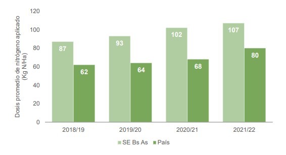 En la campaña 2021/22, a pesar del incremento en el nitrógeno aplicado se observó una disminución en el rendimiento, esto se debe principalmente a las condiciones climáticas adversas. En los meses de octubre y noviembre las lluvias fueron inferiores a las precipitaciones promedio, ocasionando una disminución del rendimiento.