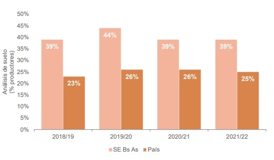 Como se ha mencionado en otros informes, el análisis de suelo es una práctica fundamental para conocer la disponibilidad de nutrientes y materia orgánica en el suelo. Realizar análisis de suelo a la siembra permite determinar el contenido de materia orgánica y de nitrógeno (NO3 ) en el perfil hasta 60 cm de profundidad, entre otras determinaciones. El análisis de la materia orgánica, la textura o tipo de suelo y la pluviosidad permite predecir el aporte de nitrógeno desde el suelo. La mineralización tiende a ser mayor donde la materia orgánica es alta. En el gráfico 3 se presenta la evolución del porcentaje de productores que realizó análisis de suelo en trigo en el Sudeste de Buenos Aires y a nivel país. La región del Sudeste de Buenos Aires presentó mayor porcentaje de productores que realizó la práctica a lo largo de todas las campañas. En la campaña 2021/22 el 39% de los productores realizó análisis de suelo en el Sudeste de Buenos Aires, mientras que a nivel nacional sólo el 25% lo hicieron. A través de un análisis de suelo no sólo se puede conocer la disponibilidad de nutrientes con el fin de planificar la fertilización y mejorar la cantidad y calidad del producto cosechado; sino también, desde el punto de vista ambiental, apuntar a reponer los nutrientes extraídos con la cosecha y obtener balances de nutrientes neutros a positivos.