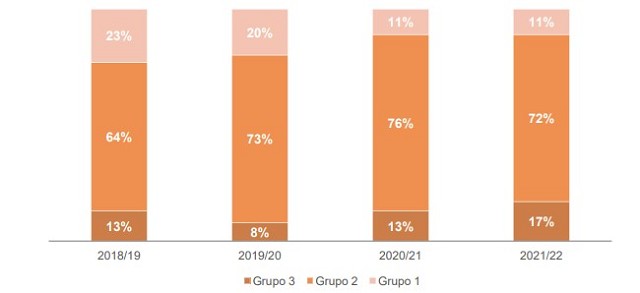 En el gráfico 1 se observa la evolución en el porcentaje de uso de los grupos de calidad para el Sudeste de Buenos Aires en las últimas campañas. En la campaña 2021/22 se mantuvo el porcentaje de uso del grupo de calidad 1 en comparación a la campaña anterior. Sin embargo, disminuyó el uso del grupo 2 en favor del grupo de calidad 3.