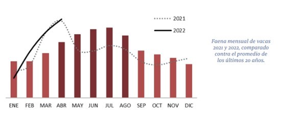 Lamentablemente, para el productor argentino, esta desaceleración de la demanda china golpea nuevamente en el peor momento de salida de vacas. Como es habitual, desde abril y hasta julio y agosto inclusive, se da el pico estacional de oferta de vacas con destino a faena. El mismo manejo de los campos exige esta salida.