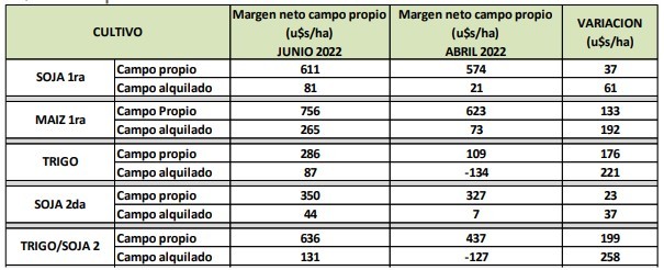 Hay cambios y son muchos. El primero es que para trigo la proyección de rinde para los cálculos se ha ajustado a la baja en función de los pronósticos climáticos y el uso potencial de tecnología. El trigo pasa a considerarse con 37 qq/ha vs los 40 que se proyectaban en abril. (aclaración: para la comparación se ha vuelto a calcular los márgenes trigueros de abril con 37 qq/ha, valor que está por debajo del punto de indiferencia, lo que explica por qué es negativo el valor que aparece para campo propio). El costo medio de los alquileres en región núcleo ha aumentado de 16 qq/ha a 18 qq/ha. El precio de los fertilizantes ha descendido, en particular la urea que pasó de 1.442 u$s/tn a 1.060 u$s/tn. Y el precio a cosecha de los commodities también varió: el maíz descendió un 10%, el trigo se mantuvo y la soja aumento un 3%. Estas alteraciones en las variables han impactado en el cálculo de los márgenes y en consecuencia en su comparación con los del mes de abril. Lo que se observa es una mejora de los márgenes netos (en términos absolutos) de todos los cultivos. La rotación trigo/soja 2° en campo alquilado es el que ha presentado la mayor variación positiva (+258 u$s/ha), mientras que la soja de 2° en campo propio es la que ha experimentado la menor mejora en los márgenes con 23 u$s más por hectárea.