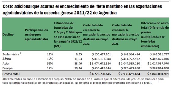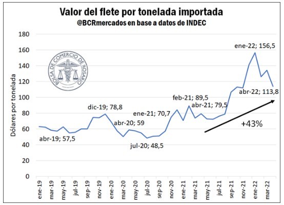 Con cerca de 40,8 Mt de importaciones de diversas mercaderías en 2021, traer este conjunto de bienes a la Argentina costó cerca de US$ 3.632 millones el año pasado. Considerando los precios promedio vistos en los primeros meses del año, y de mantenerse los valores de abril por el resto del 2022, los fletes de las importaciones se estiman en más de US$ 4.849 millones para el 2022, un 33,5% por encima del año pasado, siendo un gasto adicional para el país de más de US$ 1.217 millones adicionales.