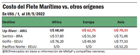 Debe notarse que el aumento en los fletes marítimos tiene un particular impacto en Argentina por su lejanía de los principales centros de consumo. Enviar un buque desde los puertos rosarinos hacia China requiere 6 días más que lo necesario desde los puertos del Golfo de México y más del doble que desde los puertos de la costa oeste norteamericana; mientras que enviar granos al principal puerto europeo conlleva 3 días más que desde Brasil y 5 más que desde Estados Unidos. Así, comparando con otros países competidores, se aprecia que, tanto para Asia como para Europa, el costo en dólares por tonelada es más elevado para los puertos de la región que para el resto. Es US$ 10/t más caro enviar a desde puertos argentinos a Europa que desde el puerto de Santos y los del Golfo; y US$ 8/t más caro enviar a Asia que desde Brasil, aunque en este caso la diferencia con los puertos del Golfo estadounidense no es tan marcada. Además, si bien es más costoso enviar granos desde el Golfo de México hacia África que hacerlo desde puertos argentinos, desde estos últimos es US$ 10/t más costosos que los envíos desde puertos de Brasil.