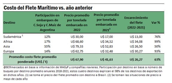 Si comparamos con la situación de hace un año, tenemos que el costo del flete promedio ponderado por la distribución de los destinos de los últimos cuatro años, el costo de cada tonelada embarcada es de casi US$ 68/t, cuando el año pasado apenas superaba los US$ 41. Es decir, se incrementó en más de un 63%.