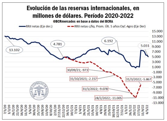 Este marco de alzas de costos resulta complejo para unas reservas internacionales que ya se encuentran presionadas. Es cierto que los términos de intercambio se están fortaleciendo, creciendo un 4,8% en el primer trimestre de este año respecto al año pasado. No obstante, los volúmenes exportados crecieron un 3,2% a nivel interanual en el primer trimestre de 2022, mientras las cantidades importadas mostraron una suba superior al 20,2%.