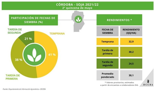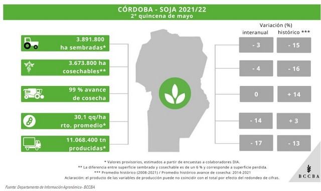 Se estima que las 3,9 millones de hectáreas proyectadas con la oleaginosa representan una merma del 3 % y del 15 % respecto a la campaña anterior y al promedio de las últimas 13 campañas respectivamente. De éstas, más de 3,6 millones serían cosechables ya que alrededor del 6 % de la superficie sembrada se habría perdido por eventos climáticos, siendo la ola de calor y falta de agua la mayor afección en soja temprana y las heladas en soja tardía.