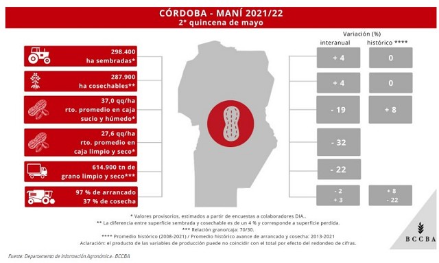 La superficie cultivada con maní marcó un aumento interanual alcanzando casi 300.000 hectáreas en la campaña 2021/22. Esta superficie representa algo más del 80 % de las hectáreas sembradas en la zona de influencia y análisis de la BCCBA.