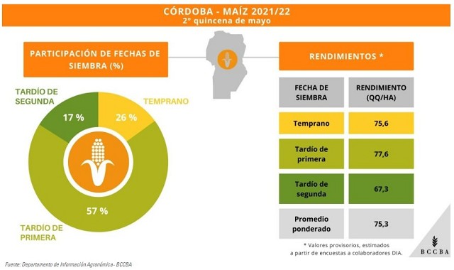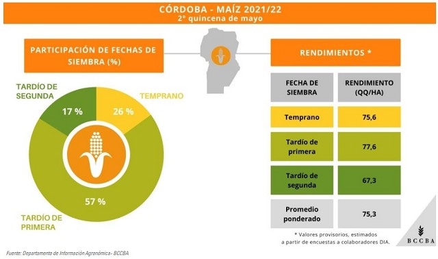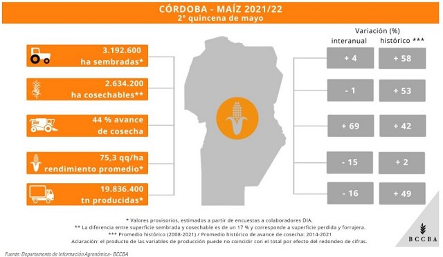 De las casi 3,2 millones de hectáreas sembradas con maíz en Córdoba, se estima que más de 2,6 millones serían cosechables, correspondiendo el 17 % restante a superficie perdida y forrajera. Las pérdidas se debieron al golpe de calor de enero, a la sequía, ocurrencia de granizo y heladas tempranas, a lo que se sumaron fuertes ráfagas de viento durante el mes por la zona de Serrano, en el departamento Presidente Roque Sáenz Peña.