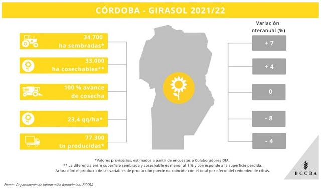 Durante la primera quincena de abril finalizó la cosecha de las 33 mil hectáreas de girasol. El rinde promedio provincial habría alcanzado 23,4 qq/ha, generando una producción de 77.300 toneladas. Estos valores productivos representan una merma interanual del 8 y 4 % respectivamente.