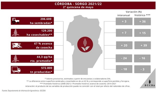 Del área sembrada con sorgo en la provincia un 63 % correspondería a superficie con destino forrajero más superficie perdida, quedando un área cosechable de casi 130 mil hectáreas. Según la segunda estimación, tanto el rendimiento como la producción, con 44,3 qq/ha y 572.800 toneladas, marcarían una baja respecto a campañas anteriores. Esta merma sería consecuencia de la sequía, las temperaturas elevadas, la incidencia de pulgón amarillo (Melanaphis sacchari) y las heladas.