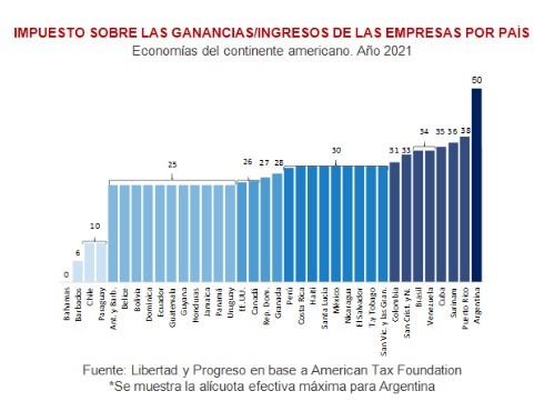 El esquema actual del Impuesto a las Ganancias para sociedades ya posiciona a Argentina entre los 10 países con mayor presión impositiva. En comparación, el impuesto sobre los ingresos de las empresas en Chile es de 10%, en Uruguay del 25% y en Perú del 29%.