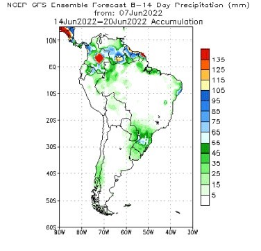 Para buena parte del centro y norte de la región pampeana, entre finales de junio y los primeros diez días de julio se cierra la oportunidad de siembra. Si bien la ventana es más larga, pasarse de esas fechas requiere cambiar de ciclo y de semillas y tener mayores riesgos de enfermedades. Por eso, para muchos la posibilidad de lluvias en los próximos quince días es fundamental para finalmente sembrar o cambiar de cultivo. Los pronósticos de corto plazo indican el ingreso de otro frente de aire frío y seco que provocará un nuevo descenso de las temperaturas y el desarrollo de heladas, alejando la posibilidad de lluvias sobre la región pampeana. "Por el momento los modelos probabilísticos muestran que posiblemente deberemos esperar hasta la segunda quincena de junio para recibir algún alivio pluvial y, de ser así, la tendencia continúa favoreciendo al extremo noreste del país", explica Aiello. Y lo dice porque hay un evento que podría dejar lluvias, pero lamentablemente, no serían suficientes y alcanzaría a un estrecho margen del este de Argentina. Se trata de un evento de lluvias entre el 14 y el 20 de junio. Pero llovería en el SE de Brasil y en Uruguay. Entre Ríos y el NE bonaerense tienen chances de sumar milímetros, cómo lo muestra la salida de la NOAA.