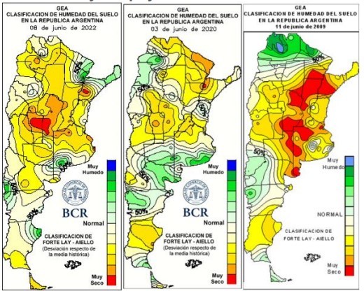 Actualmente, el 80% de la región pampeana está en una situación seca a muy seca como se observa en la imagen de anomalía de clasificación de humedad en los suelos. El centro de la sequía está en Córdoba y San Luis y empieza a ganar terreno en el NO bonaerense y el centro santafesino. En este junio del 2022 la situación de falta de agua es más grave que la del 2020. Para encontrar una situación más ajustada de humedad hay que retroceder a junio de 2009.