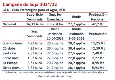 La campaña de la oleaginosa que fue duramente castigada por la falta de agua en el medio y en el final del ciclo sigue mostrando resultados que sorprenden. Los ingenieros y los productores siguen hablando de la importancia que tuvieron las rotaciones y la tecnología aplicada para salvar el escenario de desastre productivo de la sequía. En este final, se ajustaron resultados en Chaco, con 2,5 qq/ha más y 25 qq/ha como promedio final para la provincia. También en Santiago del Estero las sorpresas tanto en rindes de primera y segunda suben la vara provincial a los 31,5 qq/ha. Hubo algunos otros ajustes positivos, pero poco importantes para el volumen nacional. Mientras restan lotes aislados por cosechar en el sur de la región pampeana, se estima que el rinde nacional terminaría en 27,7 qq/ha, casi 3 quintales por debajo de la media de los últimos 5 años (30,5 qq/ha). El impacto en área no cosechada ha sido por demás de elocuente con 870 mil ha malogradas. En general se trataron de lotes de soja de segunda. El área de soja total en este ciclo ha sido de 16,11 M ha, obteniéndose 42,2 Mt a escala nacional.