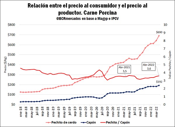 Analizando la industria porcina, tomando como representativo el precio del Capón Máximo que publica MAGyP, podemos ver que el precio del mismo se incrementó ligeramente por debajo del precio de expendio al público de la carne porcina. Entre abril de 2022 y abril de 2021, el kilogramo de capón se incrementó en un 51%, contra 55% del precio al consumidor, tomando el Pechito de Cerdo como corte representativo. La relación, en este marco, se incrementó 1,5% entre años, para ubicarse en 3,6. Desde enero de 2022, esta relación aumentó en un 6,5%, producto de un aumento del Capón de apenas un 6%, contra un aumento de la carne de cerdo al consumidor del 13%.