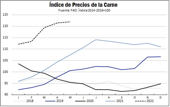 El FAO Meat Price Index, que mide evolución del precio de la carne bovina, porcina, aviar y ovina en el mundo, alcanzó su máximo valor desde que se calcula en mayo de este año. En términos interanuales, el incremento es de un 14%, con la mayor suba en el precio del cerdo, que creció un 25% entre años. Cabe mencionar que este índice está construido sobre la base de 35 precios o valores de exportación de las 4 tipos de carnes mencionadas.