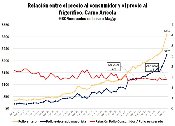 Por último, analizando el mercado avícola, este fue el que mayores variaciones de precios experimentó en el último año. Si tomamos como precio “al productor” el precio mayorista del pollo eviscerado, que publica MAGyP2 en forma mensual, y lo comparamos contra el precio del pollo entero al menudeo, puede observarse un incremento más que proporcional del precio mayorista, que no fue trasladado enteramente en el precio de venta al consumidor. Entre abril de este año y abril del año previo, el precio mayorista se incrementó en un 80%, contra un 74% del precio minorista. La relación entre el pollo entero de venta al consumidor y el precio mayorista pasó de 1,43 en abril pasado a 1,38 en abril 2022, una caída del 3,8%. En lo que va del año, el precio mayorista mostró un incremento del 44%, contra un 35% de incremento del precio al consumidor.