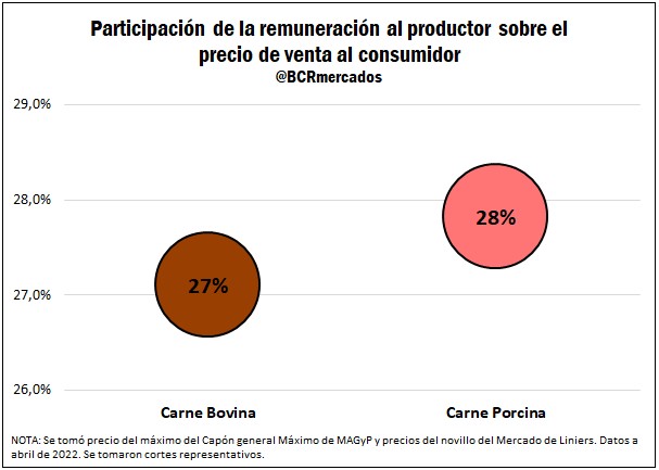 Tomando cortes representativos de los tres tipos de carne más consumidos en nuestro país, podemos ver que el productor porcino tiene una participación del 28% sobre el precio final de venta por kilogramo al consumidor final, mientras que el productor de carne bovina mantiene una participación de 27%. A la hora de analizar la industria avícola, producto de que la mayor parte de la producción nacional en esta industria está integrada verticalmente, es difícil distinguir el precio de venta del productor de pollos del precio de venta del frigorífico. Los frigoríficos cuentan con producción de aves propia, o articulan distintos contratos de producción con productores y propietarios de galpones, cuyas condiciones varían fuertemente, y cuyos precios internos de transacción son, en general, privados. Por tanto, a la hora del análisis, tomamos los precios de venta del frigorífico al por mayor en cajas de 20 kg. Esta participación, de estos dos eslabones combinados, alcanzó en febrero el 76%.