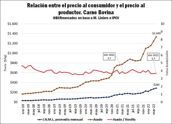 A la hora de medir la evolución de esta relación en el tiempo, podemos ver que, en el caso de la industria de carne bovina, esta relación se mantuvo mayormente constante en el último año. La evolución del precio del novillo en pie en el Mercado de Liniers se mostró en sintonía con la de los precios de la carne al consumidor, aumentando 63% en el último año la primera, contra 65% la segunda. La relación asado/novillo se ubicó en 3,7 en abril (el precio por kilogramo del asado es 3,7 veces el del novillo), cifra similar a la que se observaba un año atrás. Desde principio de 2022, sin embargo, sí se observa una caída del índice, lo que puede interpretarse como una ganancia de participación del productor en el precio final, de alrededor del 9%, producto de un incremento en el precio del novillo del 29% contra un 17% de suba del precio de la carne en mostrador.