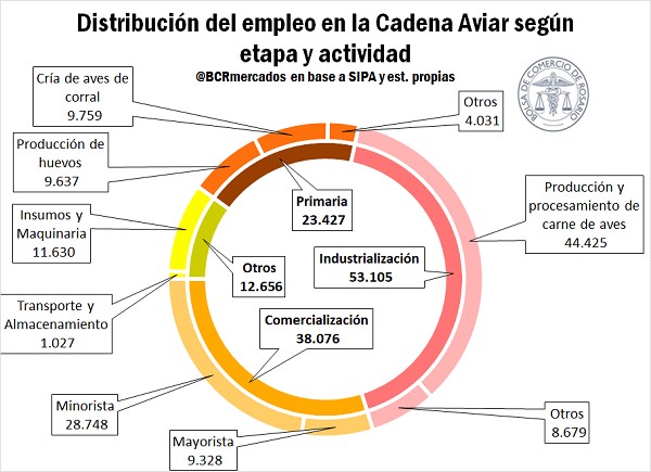 En la cadena Aviar, la distribución del empleo tiene un esquema similar al de la cadena Láctea. De los 127.264 empleos generados en la cadena, la producción primaria representa el 18% (con algo más de 9.500 que se dedican a la producción de huevos y otros tantos a la cría de aves de corral). La etapa de industrialización es la que más puestos de trabajo crea (53.105, un 42% del total), con las actividades de producción y procesamiento de siendo la de mayor importancia. En la etapa de comercialización el total de ocupados asciende a 38.076, mayormente dedicados a la venta minorista. Por último, en cuanto a las otras actividades, 11.630 puestos de trabajo son creados en la etapa de insumos y maquinaria, mientras que 1.027 lo son en la etapa de transporte y almacenamiento.