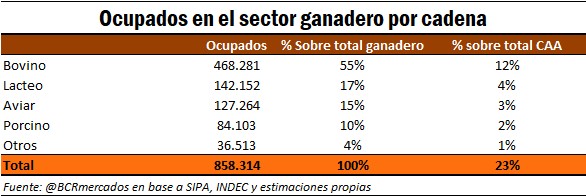 Las cadenas pecuarias generan 858.459 puestos de trabajo, lo que representa el 23% del total de empleos generados por todas las cadenas agroalimentarias argentinas y el 5% del empleo privado total en Argentina. Esta estimación comprende a todo régimen de empleo: asalariado registrado, asalariado no registrado y no asalariado (cuentapropista, patrón y trabajador familiar). Además, el enfoque utilizado para definir la al sector ganadero es su sentido más amplio, incluyendo las etapas de insumos y maquinaria, producción primaria, industrialización, comercialización mayorista y minorista de todo tipo de carnes y derivados y transporte y almacenamiento.