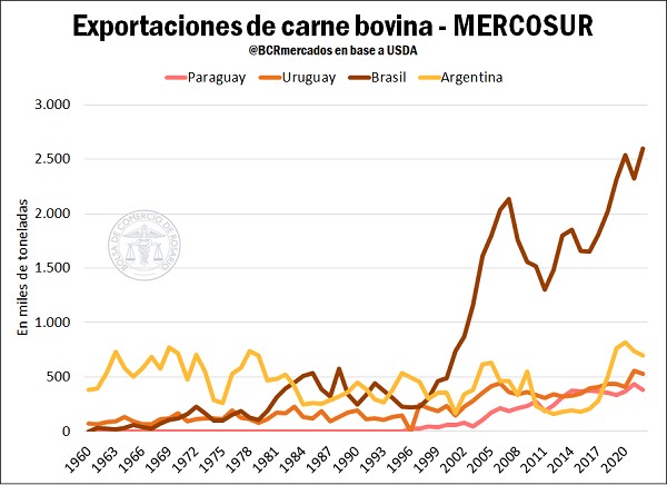 De este modo, Argentina cayó del primer puesto como exportador de carne vacuna en 1960 (cuando abastecía cerca del 40% de su demanda internacional) al puesto número cinco en 2021, con una participación del mercado de apenas el 6%. Ya en la década del ’70 cedió el liderazgo global como proveedor de carnes a Australia, que se mantiene a la cabeza hasta el 2004. Ese año, Brasil dio el batacazo posicionándose como el país que más carne bovina exportó, posición que mantiene hasta la fecha.