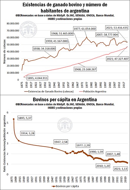 Al mismo tiempo, si añadimos a la ecuación que la población argentina se ha incrementado a un ritmo estable, obtenemos en el cálculo del consumo per cápita existe un nominador “constante” y un denominador que ha aumentado de manera casi constante. Realizando este mismo cálculo para las existencias de ganado en Argentina tenemos que el ganado bovino per cápita se encontró en el 2021 en el mínimo histórico, alcanzado 1,13 bovinos por persona, al tiempo que en 1977 (momento del máximo absoluto en existencias bovinas con 61 millones de animales) este cálculo arrojaba un resultado de 2,29 bovinos per cápita. A partir de este año, se registró una tendencia negativa que acompañó en buena medida los resultados del consumo por persona de nuestro país.