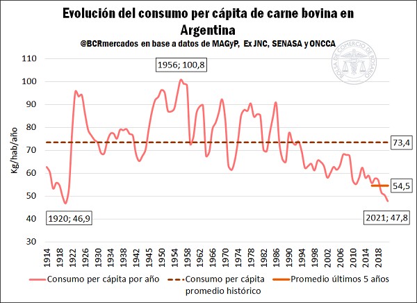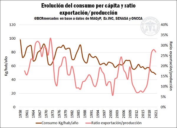 Como se puede evidenciar, el umbral productivo está dado en buena medida por los niveles de stock y ello condiciona notablemente las posibilidades de consumo en Argentina. Al mismo tiempo, las condiciones socioeconómicas locales han contribuido en la caída de la ingesta de carne bovina que, como dijimos previamente, en el 2021 se ubicó en mínimos desde 1920.