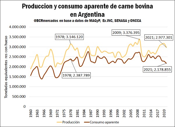 Argentina se caracterizó históricamente por sus capacidades ganaderas y por participar activamente del comercio internacional, exportando parte de los bienes producidos internamente. No obstante, desde 1975 hasta la actualidad la producción cárnica bovina se ha mantenido en un rango relativamente estable que va de las 2,5 a los 3 millones de toneladas de carne bovina, con contadas excepciones. De hecho, el 2021 no fue la excepción, contabilizando una producción de algo menos de 3 Mt (equivalente res con hueso), por debajo de los 3,2 Mt del 2020 y cortando así con una racha de 3 años consecutivos donde se había superado el límite superior del rango de 3 Mt.