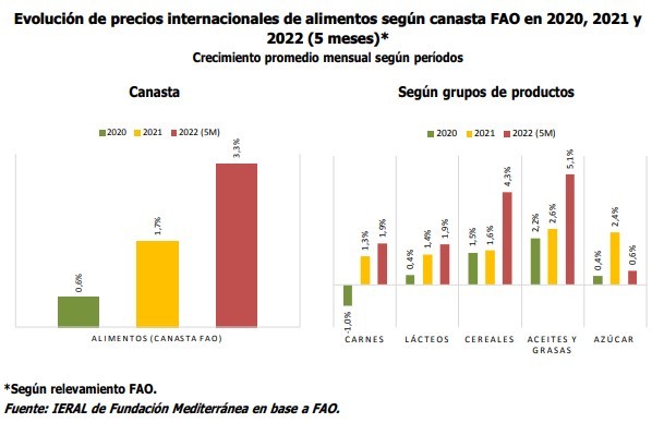 Según los relevamientos y estimaciones de FAO (Naciones Unidas) el valor internacional de una canasta de alimentos (que contiene un mix de carnes, lácteos, aceites, granos y azúcar) se viene incrementando al 3,3% mensual en los cinco primeros meses del 2022,mostrando una aceleración importante respecto del ritmo que mostrara durante los dos años previos (+0,6% mensual en 2020, +1,7% m/m en 2021). Dentro de esta canasta, los precios de todos los grupos de productos están creciendo y subiendo de nivel respecto del año previo (con excepción del azúcar), destacándose por sobre el resto los aceites (+5,1% mes) y los cereales (+4,3% mes).