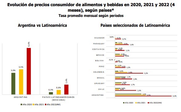 En Argentina la inflación en alimentos y bebidas no alcohólicas, que promediara el 3,5% mensual en el 2021, ha subido al 6,4% mensual en primer cuatrimestre 2022 (IPC INDEC Nacional). Por su parte, en Latinoamérica, la inflación para el mismo rubro de bienes fue del 0,6% mensual en el 2021 (valor mediano), mientras que en lo que va de este año se está ubicando en el 1,4% mensual.