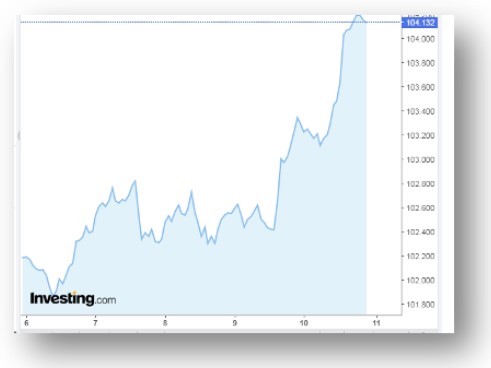 El Índice dólar, cuya evolución refleja las variaciones en el valor de la moneda estadounidense frente a otras divisas, se halla en los niveles más elevados desde finales del 2002. Tal recorrido se debe al comportamiento de «fly to quality» (volar hacia la calidad) de los inversores, cuando el cuadro global es de extrema incertidumbre y elevada inflación.