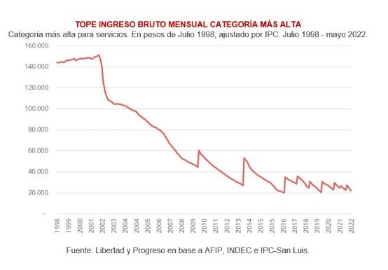 Un informe de la Fundación Libertad y Progreso alertó que, desde julio de 1998, cuando se creó el régimen de monotributo, el valor tope de ingreso bruto mensual para seguir siendo monotributista cayó 81% medido en dólares y 85% medido en poder adquisitivo (ajustado por IPC).