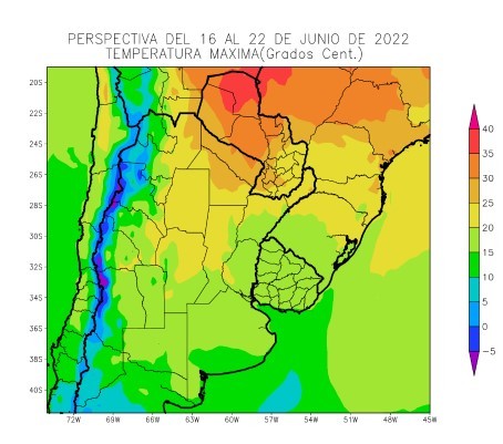 • El centro del NOA, gran parte de Corrientes, la mayor parte de Cuyo, gran parte de la Región Pampeana y el Uruguay observarán temperaturas máximas entre 15 y 20°C, con varios focos con valores inferiores.