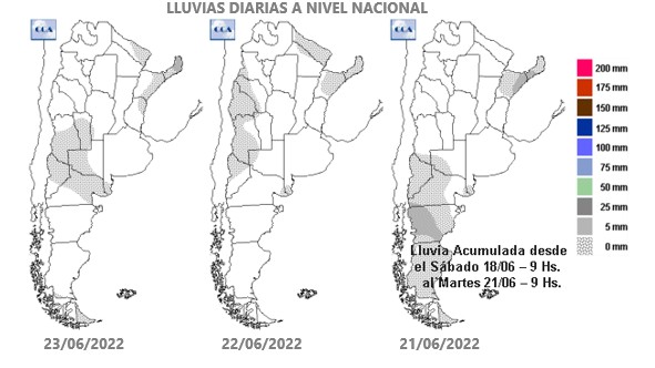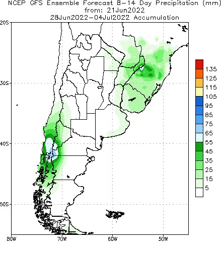 “Los pronósticos de corto plazo anticipan la continuidad de las condiciones de tiempo estable y frío que se viene observando desde finales de mayo. Las precipitaciones mantendrán una similar distribución a la que han presentado los últimos quince días, es decir sobre el noreste argentino y el noroeste de la Patagonia. Eventualmente podrían producirse algunas lluvias y lloviznas podrían alcanzar el extremo este de la región pampeana, fundamentalmente la costa Atlántica, pero con valores inferiores a los cinco milímetros”, explica el consultor Elorriaga. Esto es lo que muestra la salida del modelo de la NOAA hasta el 4 de julio. “Todo indica que junio finalizará con la misma escasez pluvial que mantuvo todo el otoño y probablemente julio se iniciará de igual modo”, concluye Aiello.