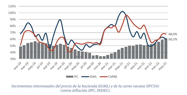 A partir de mayo, los precios de la hacienda comenzaron a mostrar retrasos respecto de la inflación. El precio de la carne, aunque se estabiliza, resiste por el momento la baja. En términos interanuales, la inflación de mayo marcó un 61,2% mientras que la hacienda -medida a través del Índice General Mercado de Liniers (IGML)- registró una suba promedio del 60,1%. La carne al mostrador, según los precios minoristas relevados por el IPCVA, registra en promedio aumentos del 68%, prácticamente sin cambios respecto de abril.