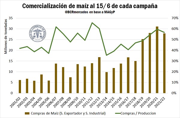 Por el lado del maíz, en tanto, las ventas se encuentran en línea con los niveles históricos. El volumen de granos amarillos comercializado hasta la fecha asciende a 27,9 Mt, por debajo de las 31 Mt de igual fecha del ciclo anterior, pero por encima de los años previos. Además, tomando las ventas como proporción de la producción, estas representan el 57% del grano obtenido en la campaña, levemente por debajo del 60% del año pasado pero 7 p.p. por encima del promedio del último lustro. Es decir, tanto en términos absolutos como en términos relativos, las ventas de maíz no registran ningún tipo de retraso.