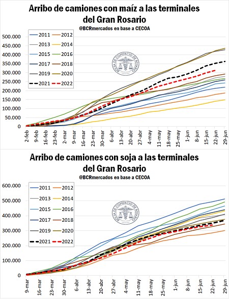 En la jornada del jueves, el número de camiones ingresados cayó fuertemente producto de los conflictos que se están desatando en las diversas rutas del país, que tienen virtualmente paralizado el transporte de cargas en Argentina. El número total de unidades arribadas hasta las 7 a.m. a las terminales portuarias de la región fue de 409, un mínimo desde principios de marzo. Para tomar noción, el promedio de ingreso diario en la semana anterior utilizando esa metodología fue de 3.407 unidades, y el día que menor cantidad de camiones ingresaron fue el lunes con 2.068. Es decir que las complicaciones logísticas han hecho mella sobre el ingreso de camiones a las terminales portuarias de la región. Además, el total de camiones con maíz fue de 187, mínimo desde principios de febrero, y el de soja fue de 140, el más bajo en más de 3 meses.