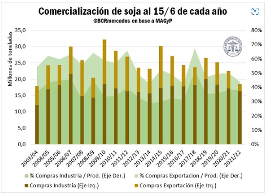 Cuando observamos el volumen de compras del sector industrial y del sector exportador, podemos tener un panorama algo más claro acerca de qué es lo que está ocurriendo. El sector industrial lleva adquiridas 16,2 Mt de la oleaginosa. Si bien este volumen es inferior al registro de las últimas campañas (en los últimos 5 años el volumen comercializado hacia mediados de junio se ubicó entre 17,1 y 20 Mt), tomado como proporción de la producción el volumen adquirido por la industria está por encima de los niveles históricos para mediados de junio, superando lo ocurrido en los últimos años. Las compras del sector representan el 39% de la producción de la campaña, mientras que solamente una vez en los últimos 10 años se superó esta proporción: en la 2017/18 representaban el 52%.